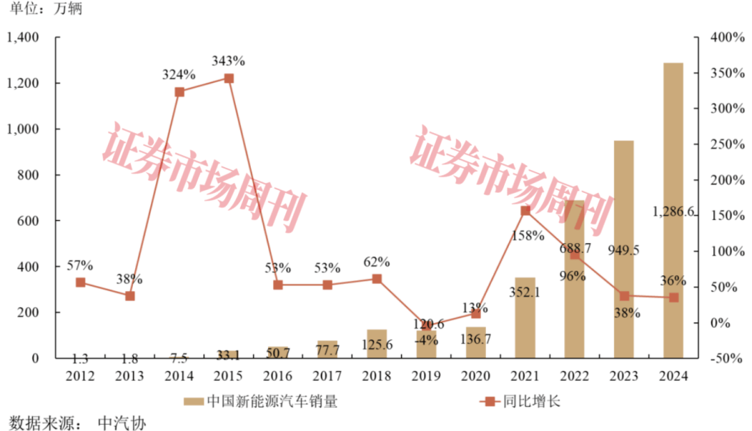 近年来□,国家陆续出台一系列支持新能源汽车及关键零部件产业发展的法律法规与产业政策,通过提倡绿色环保理念、严格排放油耗法规,推动商用车加速向新能源技术应用转型。技术进步、政策加码与成本的下探,正共同推动我国新能源产业的发展◁○…。根据中国汽车工业协会统计数据显示,2024年我国新能源汽车销量为1286▲.6万辆▲,同比增长36%▷,连续10年保持全球第一。