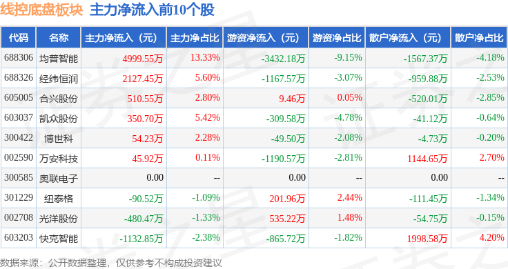 从资金流向上来看,当日线控底盘板块主力资金净流出4.74亿元,游资资金净流入8329.11万元,散户资金净流入3.91亿元。线控底盘板块个股资金流向见下表: