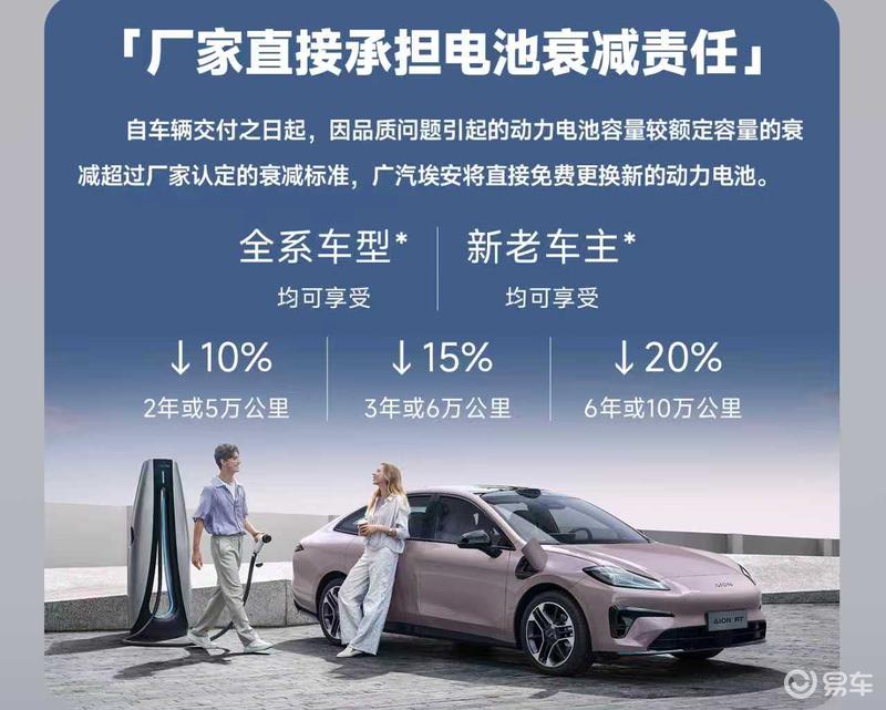 在电池衰减保障上,自车辆交付之日起,因品质问题引起的动力电池容量较额定容量的衰减超过厂家认定的衰减标准,埃安将直接为用户免费更换新的动力电池;