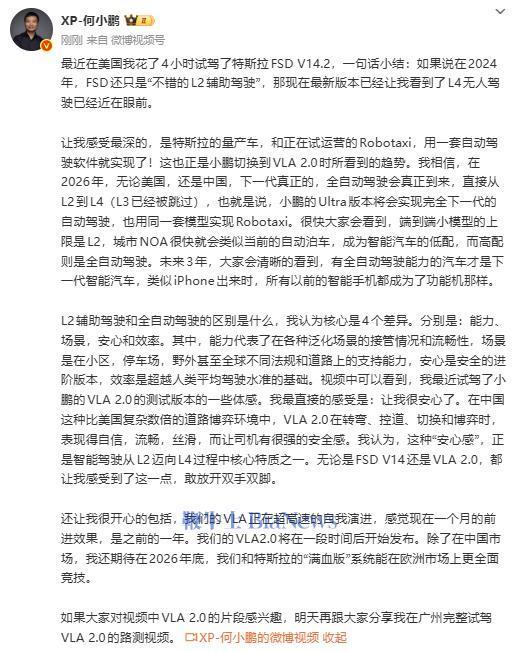 何小鹏特别提到,特斯拉通过一套自动驾驶软件实现了量产车和正在试运营的Robotaxi的功能。这与小鹏切换到VLA 2.0时所观察到的趋势一致-▪。他预测,在2026年,无论是在美国还是中国-▲,下一代真正的全自动驾驶将会到来,直接从L2跃升至L4••◇,跳过L3阶段。这意味着小鹏的Ultra版本将实现完全下一代的自动驾驶,并且同样使用同一套模型来支持Robotaxi。