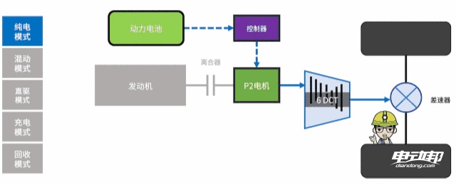 纯电模式:「发动机」不参与工作□,「电池」带动「P2电机」,纯电驱动•…=,适用于城市路况◆▪;