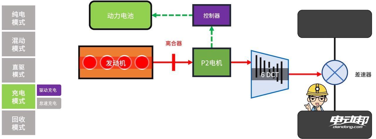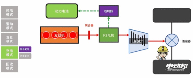 1. 驱动充电:由于「P2电机」直接套在「双离合变速器」的「输入轴」▼△○,故此△◇○,当「发动机」在驱动时,带动「P2电机」,从而为「电池」补能;