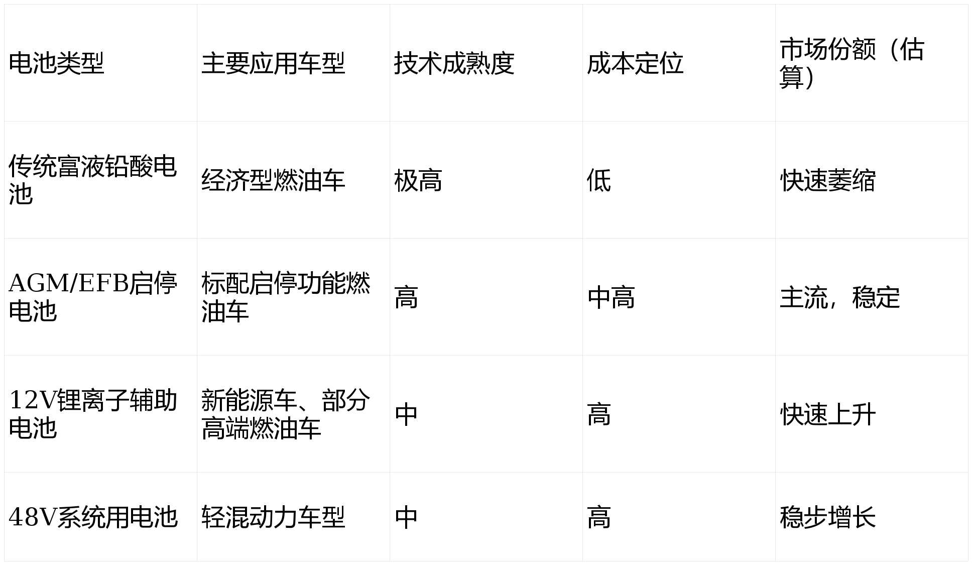 1. 供需结构▽:需求侧与国内乘用车产销,特别是经济型、紧凑型车型的销量波动强相关•。供给侧产能充足,但高端启停及低压锂电产能正在结构性扩张。下表概括了当前主流技术路线的应用现状: