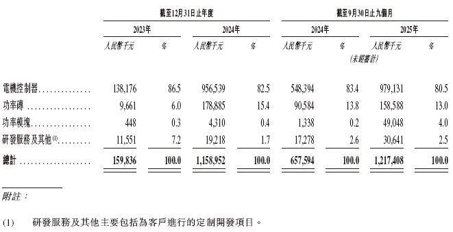 臻驱科技大部分收入来自销售电机控制器○,以及来自销售功率砖•、功率模块、研发服务及其他。