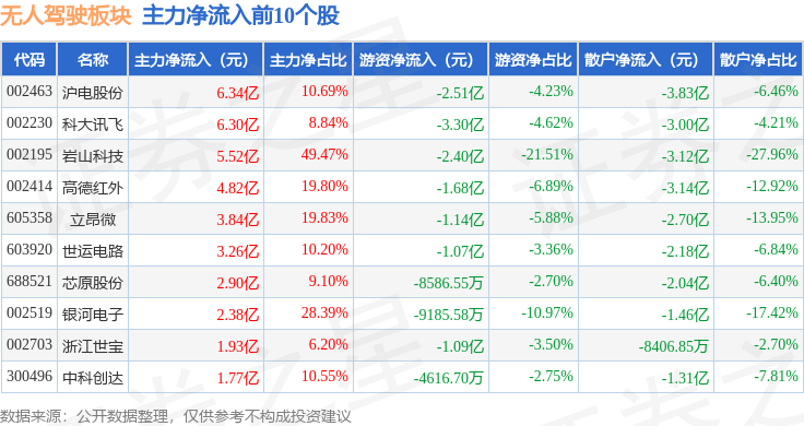 从资金流向上来看…▷●,当日无人驾驶板块主力资金净流入8.97亿元,游资资金净流出29.58亿元,散户资金净流入20.62亿元。无人驾驶板块个股资金流向见下表◁: