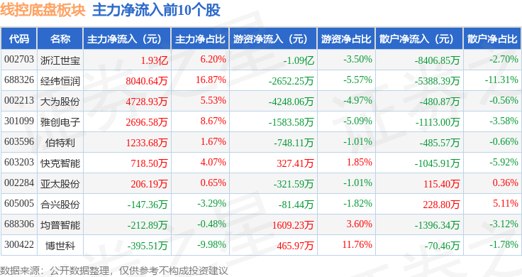 从资金流向上来看○,当日线控底盘板块主力资金净流入2=•.23亿元,游资资金净流出1.63亿元,散户资金净流出5968.7万元。线控底盘板块个股资金流向见下表: