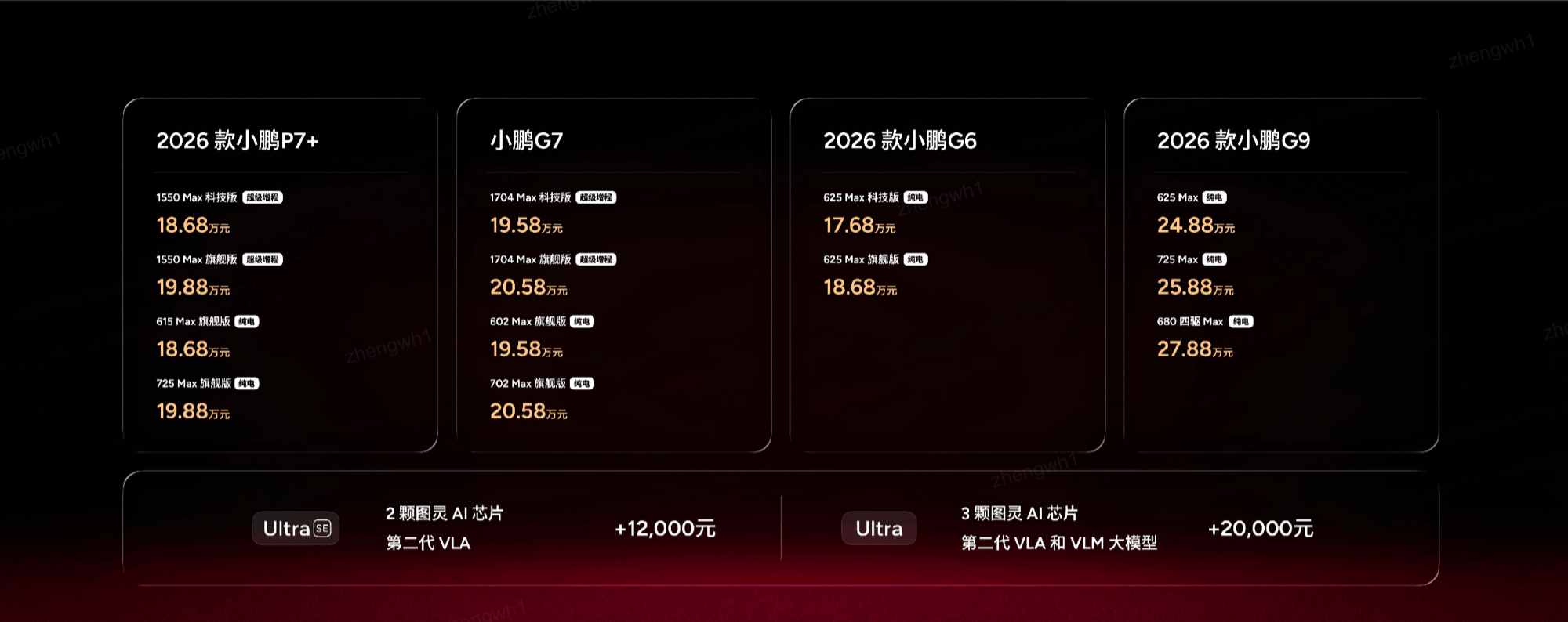 央广网北京1月9日消息(记者董楠)1月8日▽□,在2026小鹏全球新品发布会上,正式发布2026 款小鹏 P7+、小鹏 G7 超级增程、2026 款小鹏 G6-•、2026 款小鹏 G9。其中2026款小鹏P7+ 全球36国同步发布,新车有超级增程和纯电两种能源形式,超级增程有1550 Max 科技版和1550 Max 旗舰版,官方指导售价为18.68万元和19…▪▼.88万元▪☆▼;纯电有615 Max旗舰版和725 Max 旗舰版,官方指导售价为18▼△•.68万元和19.88万元◆。2026款小鹏G7推出四个版本•△,超级增程1704 Max 科技版和1704 Max 旗舰版,官方指导售价为19.58万元和20.58万元★☆▼;纯电602 Max 旗舰版和702 Max 旗舰版…▽,官方指导售价为19△▪.58万元和20△★.58万元▽◇◇。2026 款小鹏 G6推出纯电625 Max 科技版和625 Max 旗舰版◇=,官方指导售价为17•★△.68万元和18.68万元▷。2026 款小鹏 G9推出纯电625Max○•●、725 Max和680 四驱Max版☆★,官方指导售价为24.88万元、25.88万元和27.88万元★。即日起至2026年3月31日(含)前下定还可享多项权益◆。