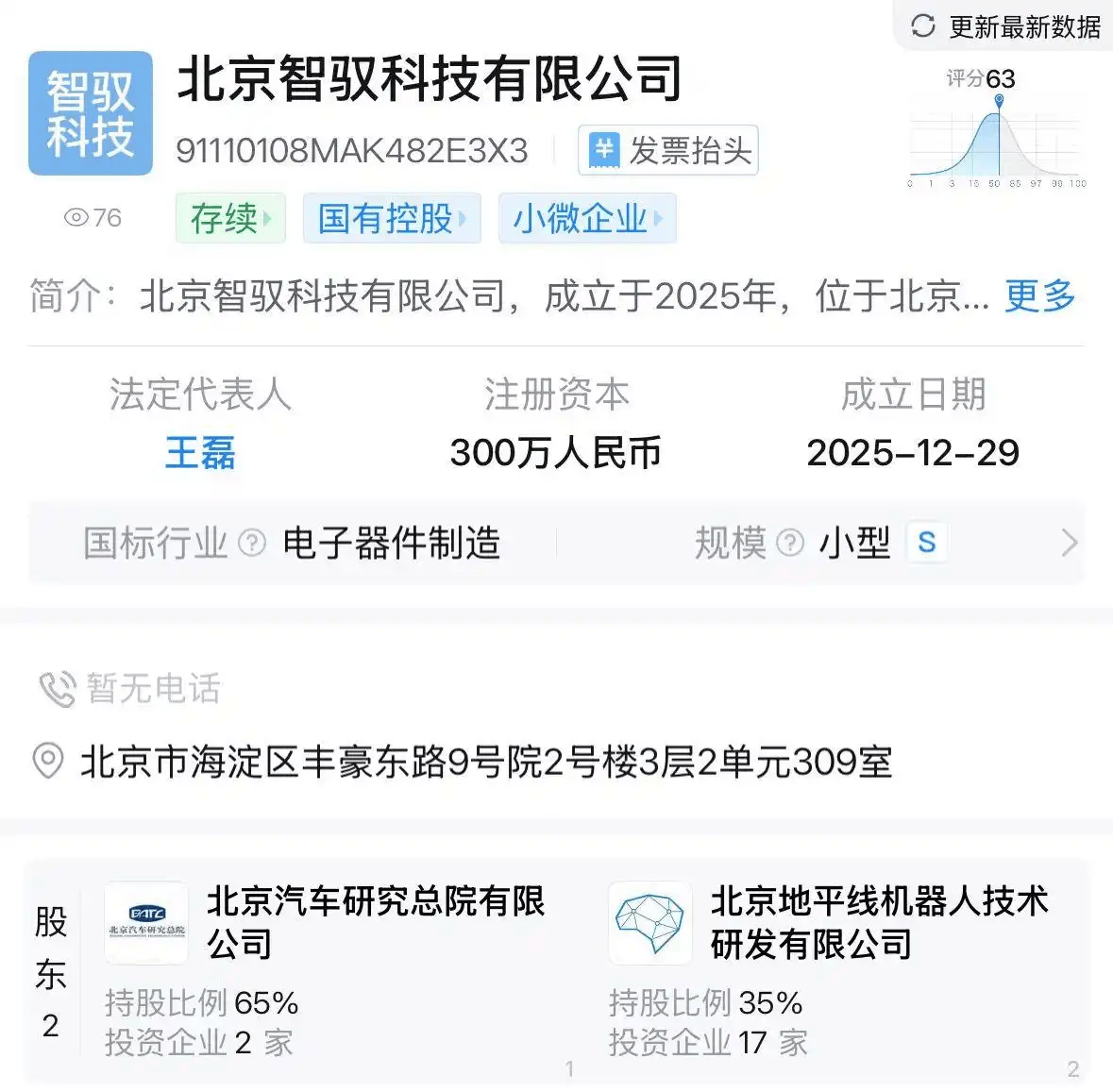 工商登记信息显示,新公司注册资本300万元,股权结构为北京汽车研究总院有限公司持股65%,为控股股东●;北京地平线机器人技术研发有限公司持股35%•…,双方形成深度资本绑定。
