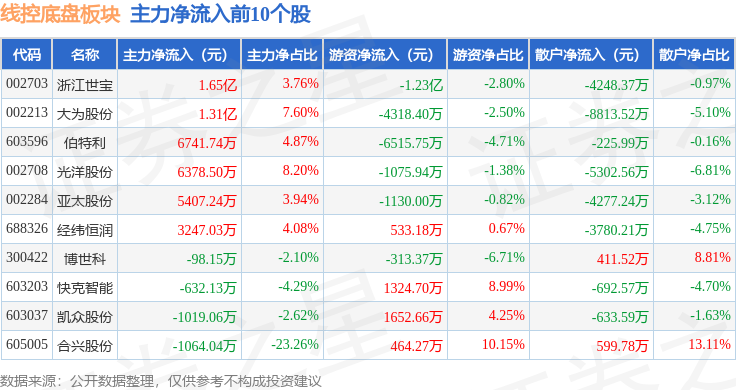 从资金流向上来看••▲,当日线控底盘板块主力资金净流入3.51亿元,游资资金净流出2=▲◁.2亿元,散户资金净流出1.31亿元。线控底盘板块个股资金流向见下表: