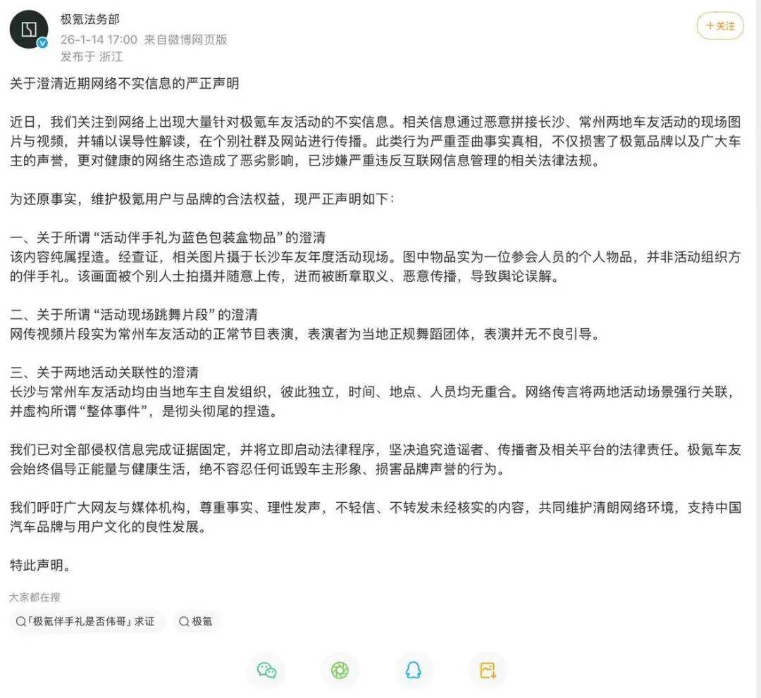 声明指出▪…,近日网络上出现大量针对极氪车友活动的不实信息。相关信息通过恶意拼接长沙、常州两地车友活动的现场图片与视频,并辅以误导性解读-,在个别社群及非法网站进行传播。