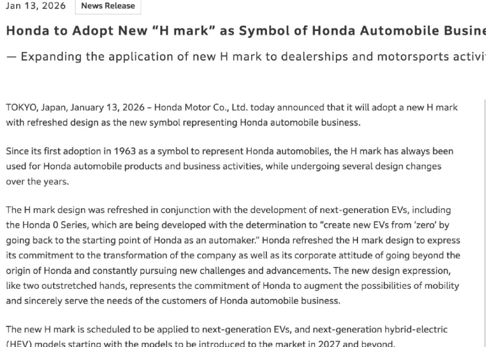 2026年1月13日▲,本田汽车株式会社宣布,将采用经过全新设计的新H标作为其汽车业务的崭新象征。并且新H标将同步应用于经销商网络与赛车运动。