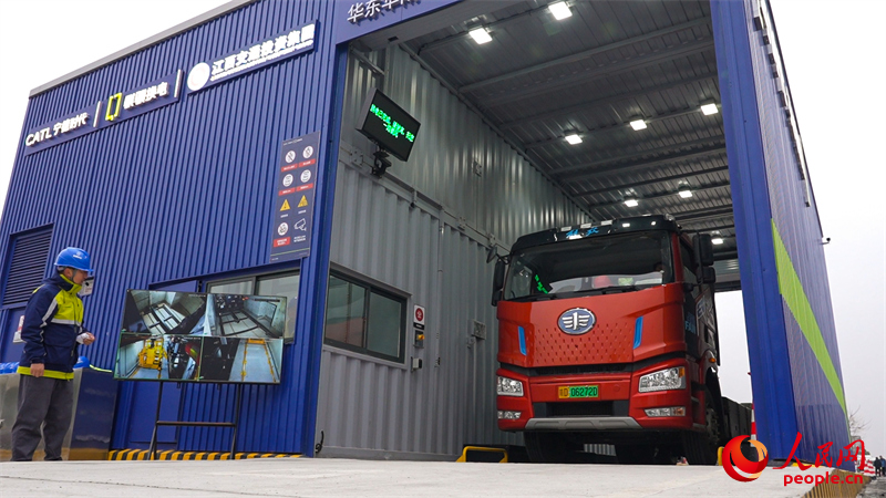 G60沪昆高速龙虎山服务区,一辆重型新能源卡车正在进行换电。人民网 孔文进摄