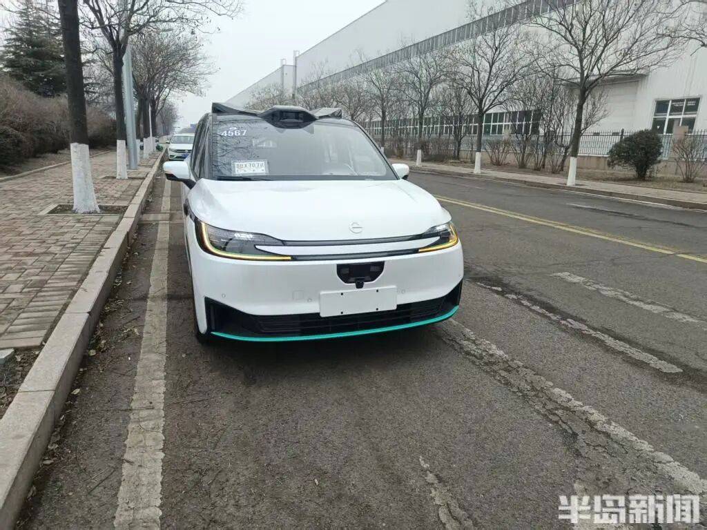这是一辆白色的MPV,车顶及前后等部位装有多个摄像头。从外观上看,该车正是此前在高新区火炬路一处停车场探访时见到的同款车型。不同的是,此时车身已贴上“萝卜快跑”字样,并且还喷上了二维码。