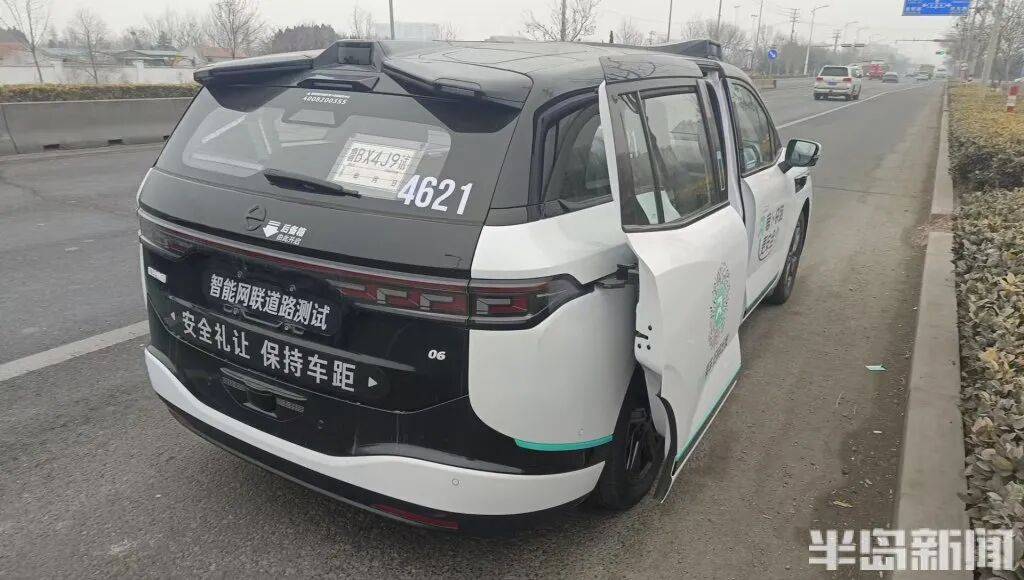 该车前后标有醒目的数字编号,车尾部印有“智能网联道路测试”字样,提醒过往车辆安全礼让、保持车距。