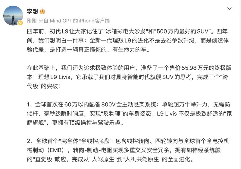 此外,全新理想L9还搭载全球首个完全体全线控底盘,包含线控转向、四轮转向与全球首个全电控机械制动(EMB)。转向-制动-电驱实现多重交叉安全冗余,拥有如神经系统般的直觉级响应,完成从人驾原生“到“人机共驾原生的全面进化。结合此前报道,新车在电池上也将进行升级,增程电池电量将超过70度,支持纯电续航超过400公里。