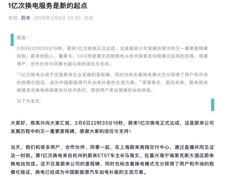李斌还表示,1亿次换电,意味着换电完成从设想到规模化运行的验证。今天,单日换电服务量已经突破10万次。换电模式的稳定、便利和长期价值得到用户的高度认可,换电正在成为中国新能源汽车加电补能的主流方案。这不是蔚来一家公司的努力,而是与用户、合作伙伴与产业共同推动的成果。