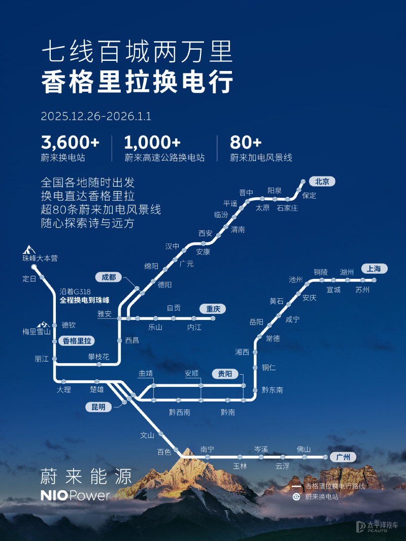 “加电风景线”是蔚来针对热门旅游路线推出的专项换电网络布局。目前蔚来已贯通超过80条加电风景线川藏线月,随着德钦梅里雪山蔚来换电站上线,蔚来滇藏换电路线实现全线贯通。该路线座蔚来换电站。